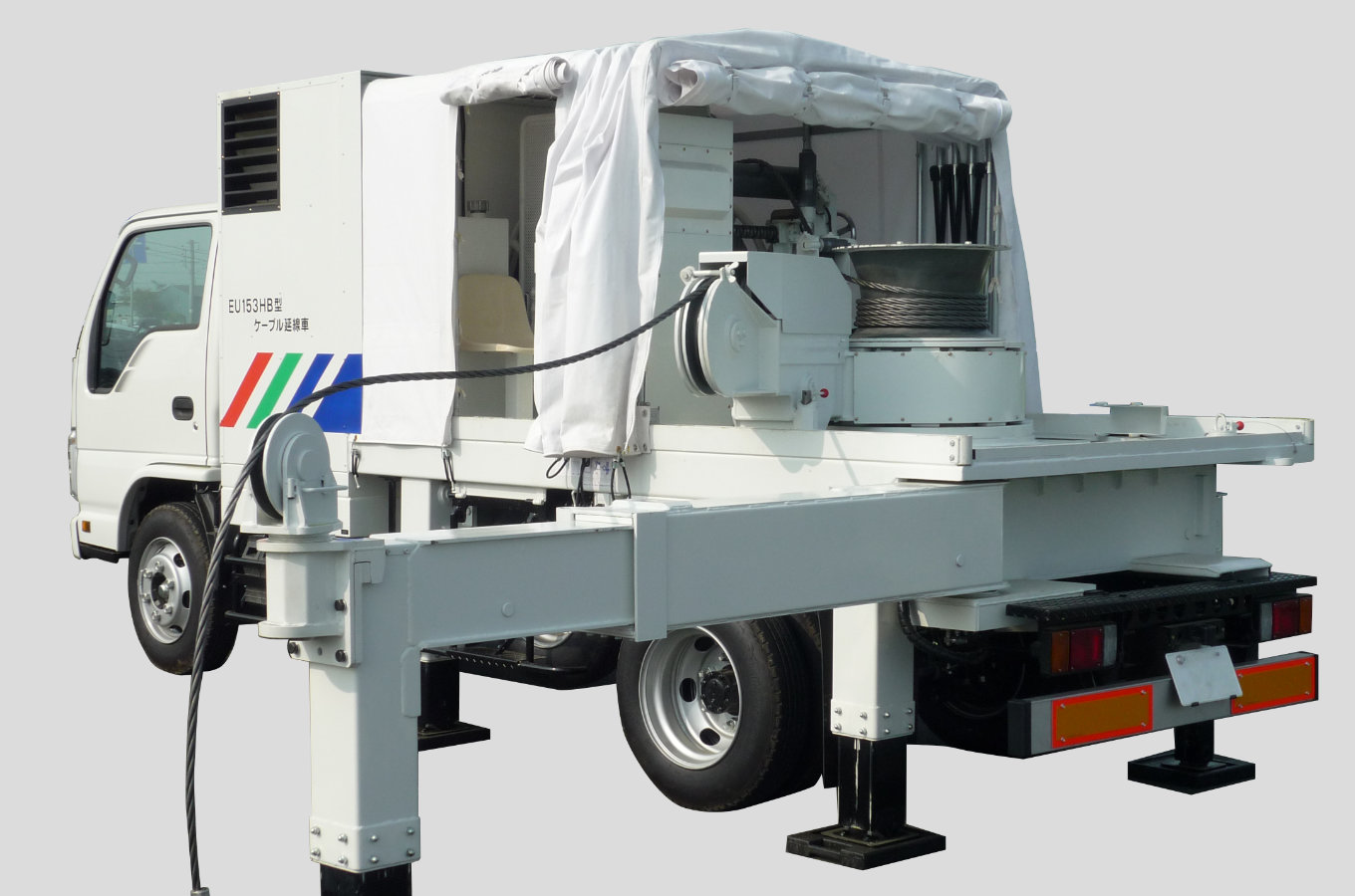 本機は地中線ケーブルの引き入れ作業に使用することを目的として考案された工事車両です。工事を行う上で安全性、作業性の向上を図り、合わせて張力計等の計器類を装備することにより、品質管理向上にも目を向けて製品化された車両となります。
