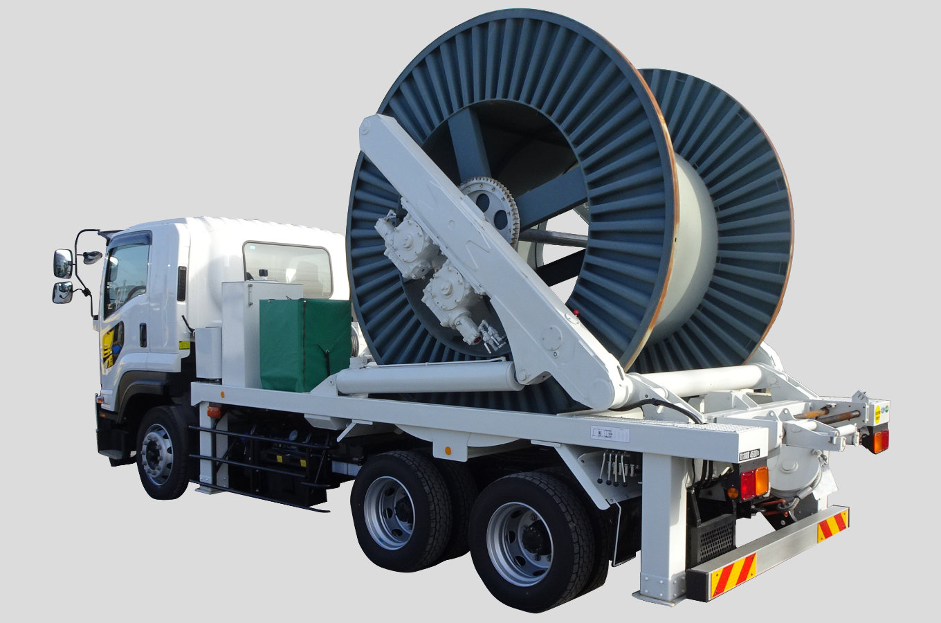本機は地中線ケーブルの撤去作業に使用する巻取式撤去車です。